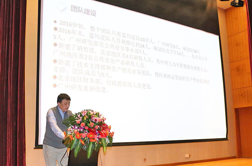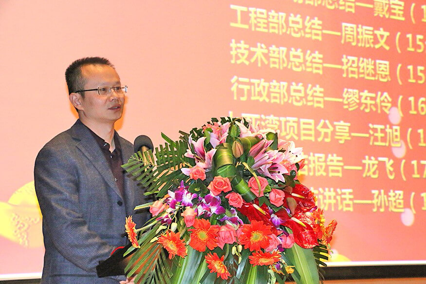 總結(jié)大會上,在公司副總裁戴寶先生激情洋溢的開場白后,副總裁錢洪濤先生、杰創(chuàng)智能董事兼藍瑪星際總經(jīng)理朱勇杰先生、財務(wù)總監(jiān)兼董秘李卓屏女士、副總裁戴寶先生、工程部總監(jiān)周振文先生、技術(shù)部總監(jiān)招繼恩先生、行政部總監(jiān)繆東伶女士、工程部副總監(jiān)汪旭先生、總裁龍飛先生先后登臺,分別做了2016年度工作總結(jié)。