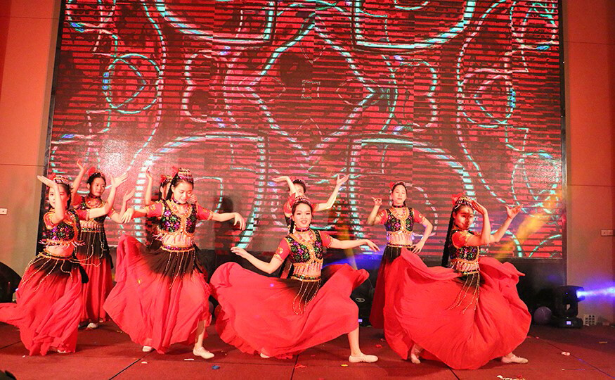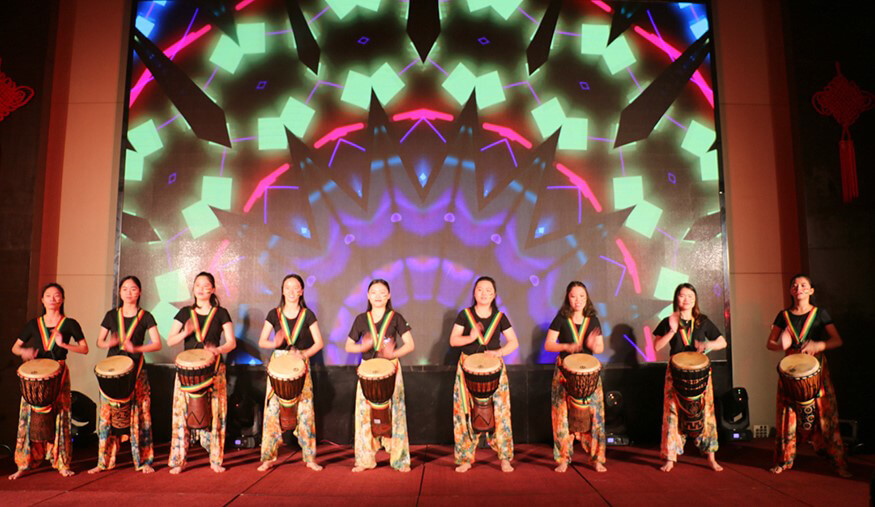 隨著一陣激越的鼓聲響起,全場的目光都投向了舞臺。公司特邀表演團(tuán)隊鳳凰花音樂工坊的一群靚麗少女,手起手落,靈巧有力地拍打著非洲鼓,神采飛揚(yáng)。再配以優(yōu)美的歌聲舞姿,盡顯異域風(fēng)情。鼓聲時而激越急促,時而渾厚悠宛,聲動全場,直擊人心,瞬間引爆現(xiàn)場氛圍,拉開了迎新年會的大幕。